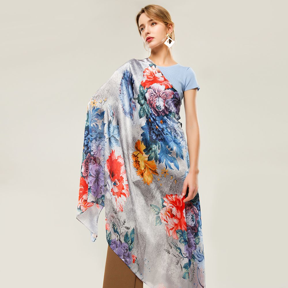 Classic Printed Silk Satin Peony Pattern Ladies Scarf With Double Color Shawl In Stock